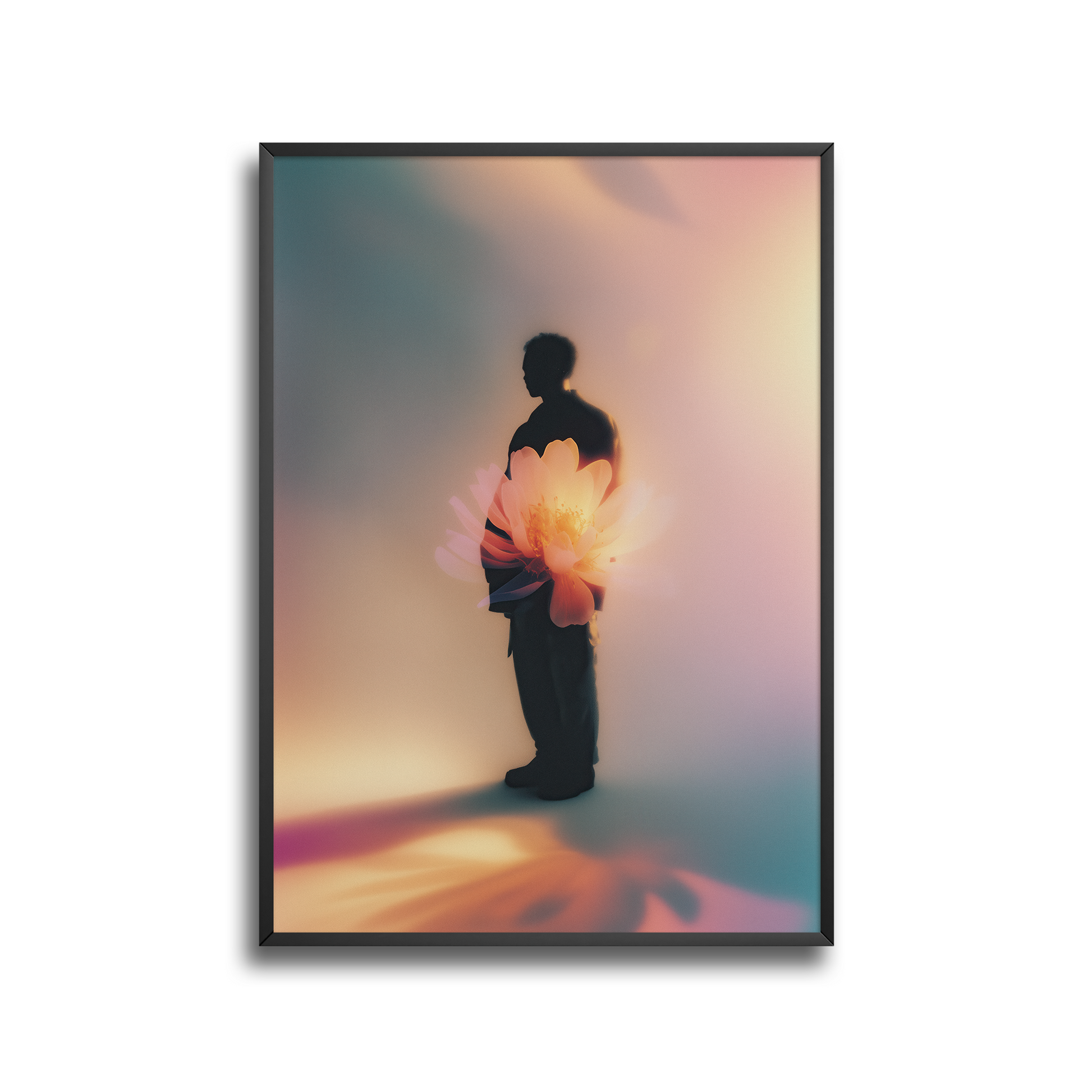 La silhouette se fond dans une lumière pastel, tandis qu’une fleur éclot au cœur de son être — symbole de renouveau, de sensibilité et d’équilibre intérieur.